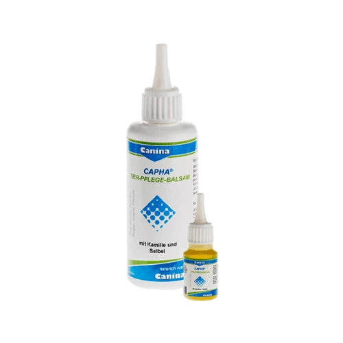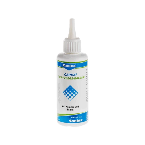 Capha Dierverzorgingsbalsem van Canina is bereid met waardevolle kamillebloemen en salie-extracten. Het is speciaal ontwikkeld ter verzorging en reiniging van beschadigde delen van de huid, slijmvliezen en vacht bij kleine en grotere (huis)dieren. De balsem draagt bij aan de verzorging van de huid na insecten- of tekenbeten en krab- en bijtwonden. Ook voor de verzorging van druk- en schuurplekken veroorzaakt door halsbanden, zadels of halsters is dit product geschikt. Capha Dierverzorgingsbalsem is tevens geschikt voor het verzorgen van de oren, staart, hoeven en poten.