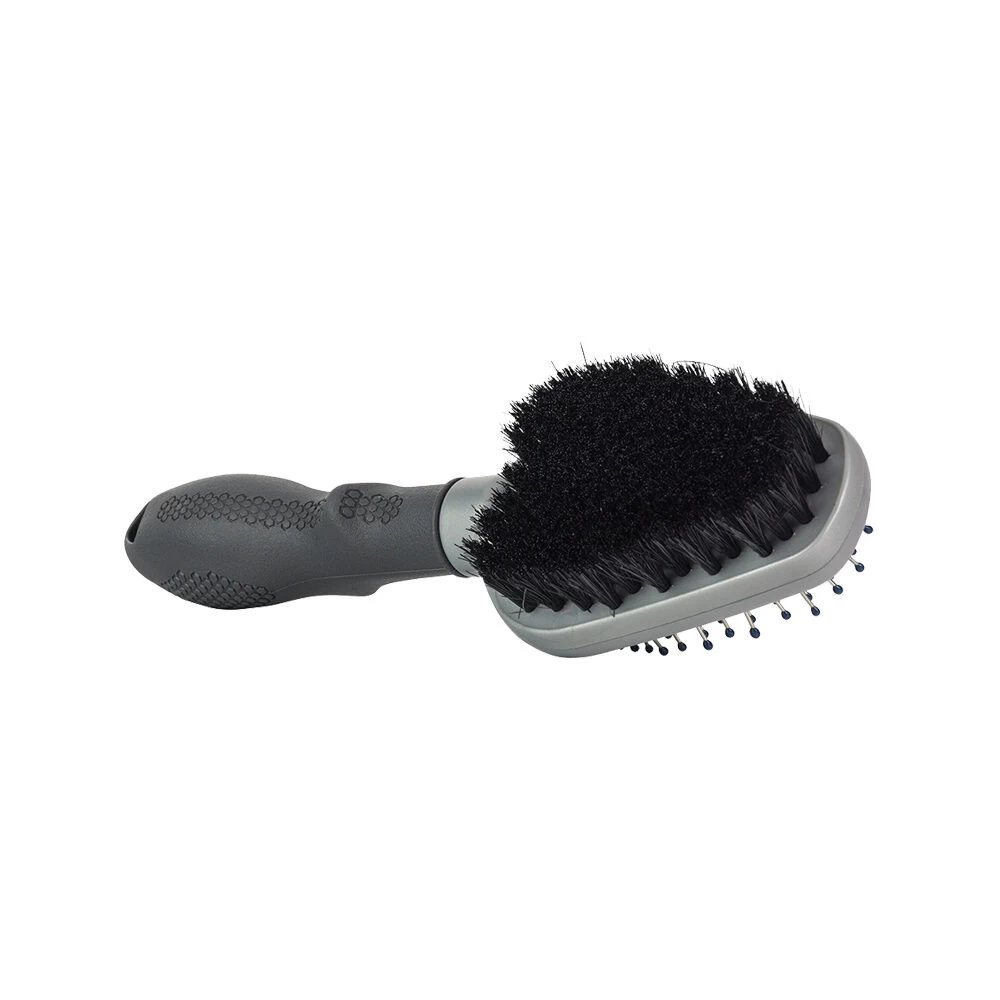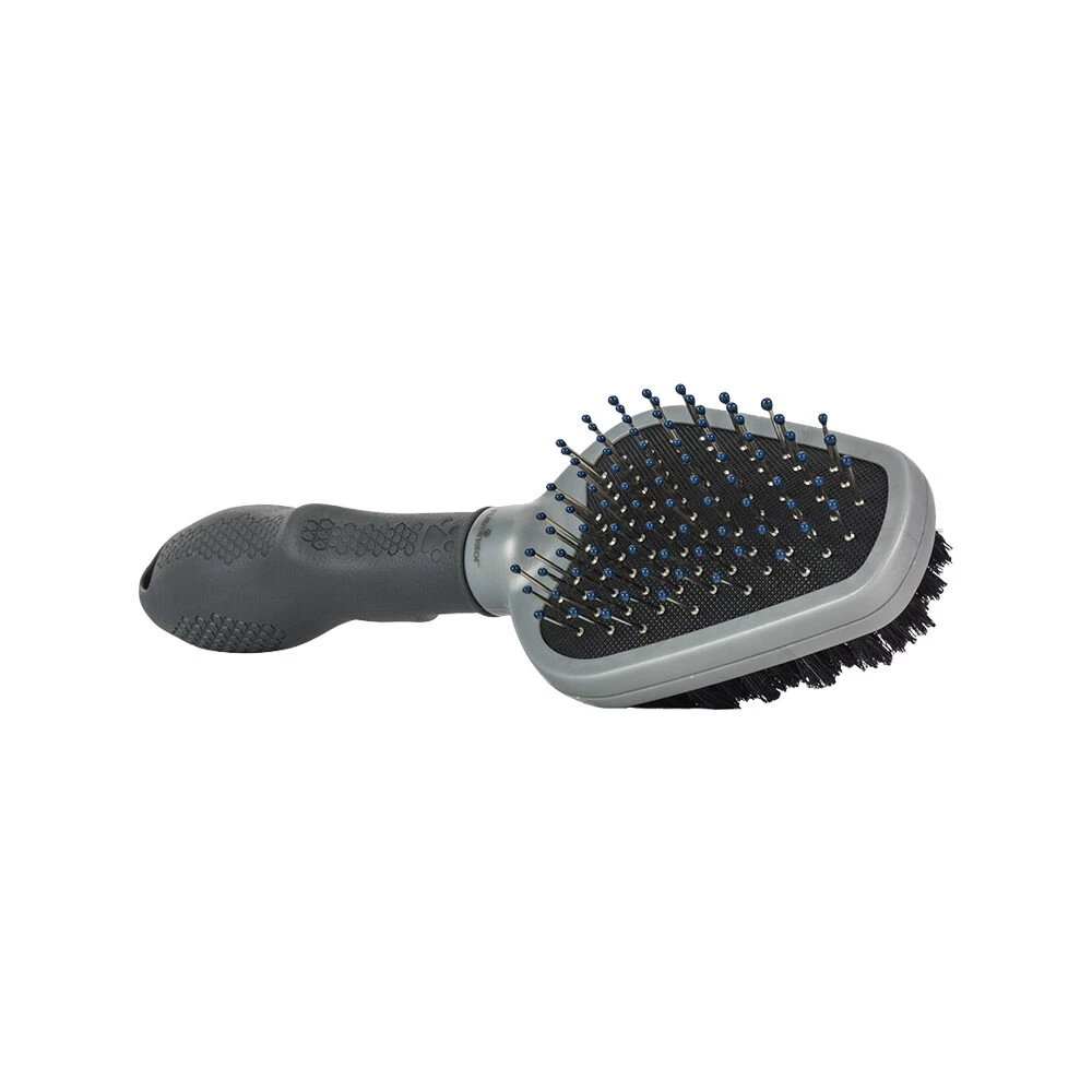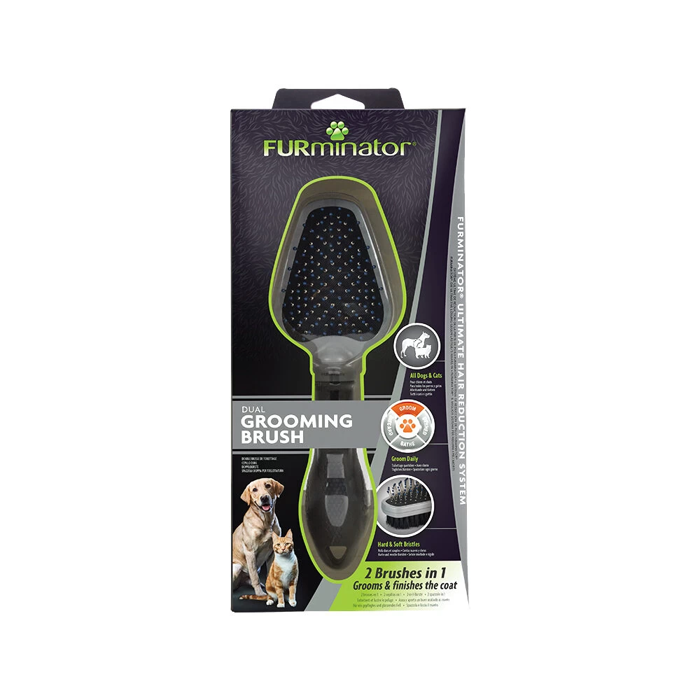 Door het tweezijdige ontwerp van de FURminator Dual Brush is de borstel bruikbaar voor bijna alle vachtsoorten. De harde borstel aan de ene kant helpt bij het verwijderen van vervilting, losse haren en klitten bij honden met een lange vacht. De zachte nylon haren aan de andere kant zijn geschikt voor het kammen van bijna alle vachtsoorten. De flexibele kop volgt de contouren van het lijf van uw hond. Door de gemakkelijke handgreep is de borstel comfortabel in gebruik.