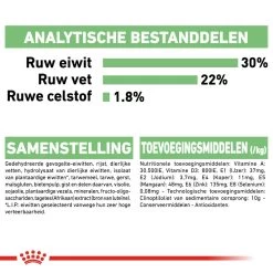 Gedehydreerde gevogelte-eiwitten, rijst, dierlijke vetten, isolaat van plantaardige eiwitten, tarwemeel, hydrolysaat van dierlijke eiwitten, gerst, maïsgluten, bietenpulp, gist, visolie, plantaardige vezels, sojaolie, mineralen.
