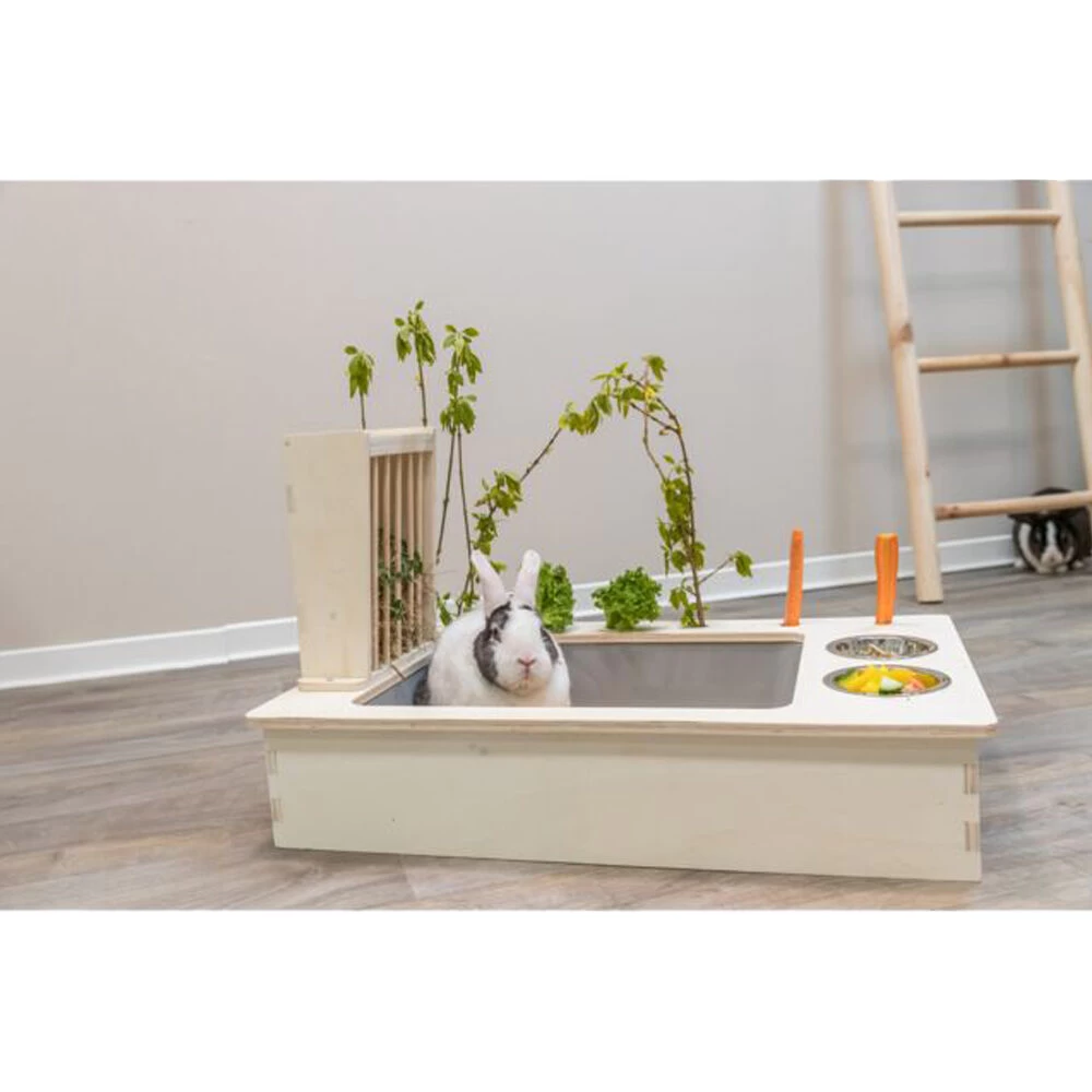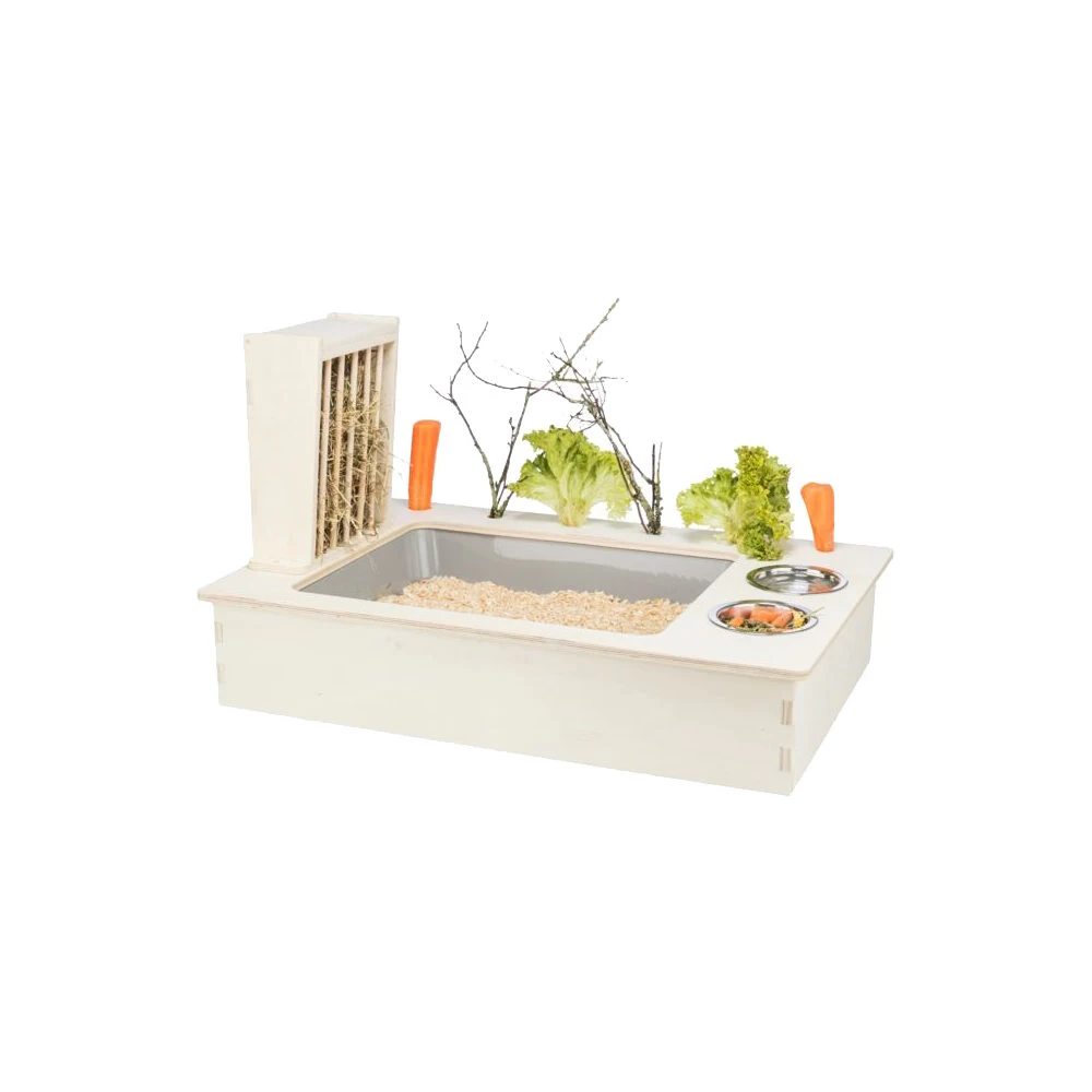 Met dit voederstation van Trixie kunt u uw knaagdier op een leuke manier voorzien van verschillende soorten voer. Uw huisdier kan zelf kiezen wat hij of zij wilt eten en zal nooit tekort komen. Het beschikt over 2 RVS-voer/waterbakken en een hooiruif. Er zijn nog extra openingen voor takjes en groenten en het heeft een uitneembare toiletpot van kunststof. De voederruimte is gemaakt van onbehandeld hout.