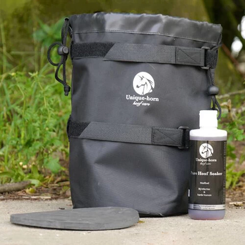 Voeg een scheutje Unique-horn Pure Hoof Soaker toe aan 200 tot 300 ml water in de Soaking Bag en plaats de hoef van uw paard in de zak. Trek het touwtje en de klittenbandsluitingen aan en laat uw paard ongeveer 20 tot 30 minuten weken. Houd de tijd goed bij! Een te korte tijd aan weken kan voor onvoldoende behandeling zorgen. Te lang weken kunnen alleen maar meer ellende veroorzaken.
